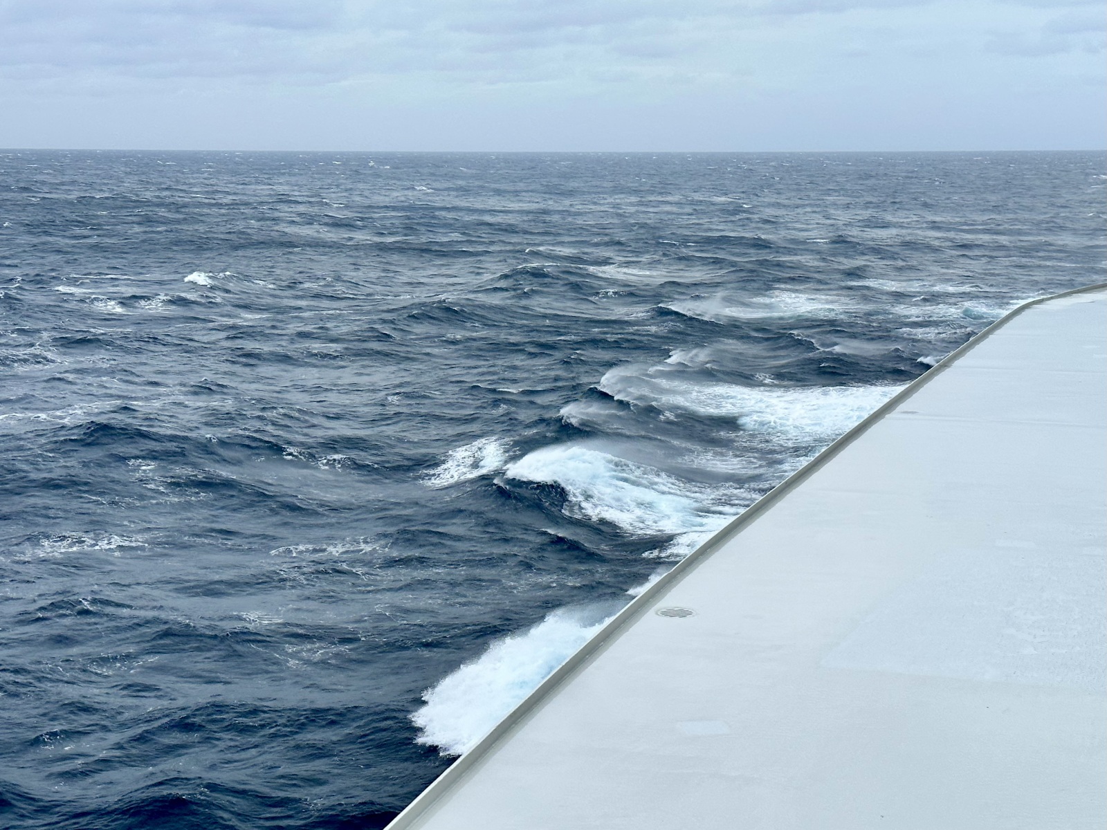 While at sea, especially at night it was a head wind and experienced flying fish on a balcony (not ours) and a bird, exhausted taking refuge. As an example we were doing 18 kns into a 30 kns head wind. We had an upgrade to a restricted view balcony cabin, deck 7, directly below the bridge. However we have a bulkhead to the cabin next door. Therefore the wind has nowhere to go and rattles the balcony door which whistles with wind.